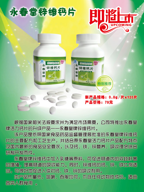 永春堂牌活力鈣片的升級產(chǎn)品—永春堂牌鋅維鈣片鋅維鈣片:國食健字G20080410,國家食品藥品監(jiān)督管理局批準(zhǔn)。 根據(jù)國家相關(guān)法規(guī)要求為并滿足市場需要,公司特推出永春堂牌活力鈣片的升級產(chǎn)品—永春堂牌鋅維鈣片?! ≡摦a(chǎn)品是依照國家食品藥品監(jiān)督管理局批準(zhǔn)的永春堂牌鋅維鈣片的主要配方和工藝生產(chǎn),并結(jié)合原永春堂活力鈣片產(chǎn)品配方特點及國內(nèi)最新的食品安全要求,以及鈣、鐵、鋅營養(yǎng)、吸收理念綜合研制...