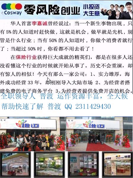 ecoswaye科士威科士威財(cái)務(wù)自由至尊系統(tǒng)恒信團(tuán)隊(duì)普渡河南鄭州15928855671QQ:23114294301、免投資、無風(fēng)險(xiǎn)不需要投資龐大的資金、根本不必承擔(dān)所謂的投資風(fēng)險(xiǎn),更沒有經(jīng)營事業(yè)的諸多壓力。因?yàn)?,透過e科士威的規(guī)劃運(yùn)作,以及完善可靠的創(chuàng)業(yè)道路,遵循前人積累的智慧軌跡,再加上自己的勤奮努力,就能創(chuàng)造一個(gè)真正屬于自己的事業(yè)。2、無條件限制沒有傳統(tǒng)就業(yè)市場存在的諸多難以跨越的門檻,也沒有