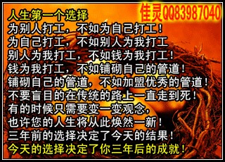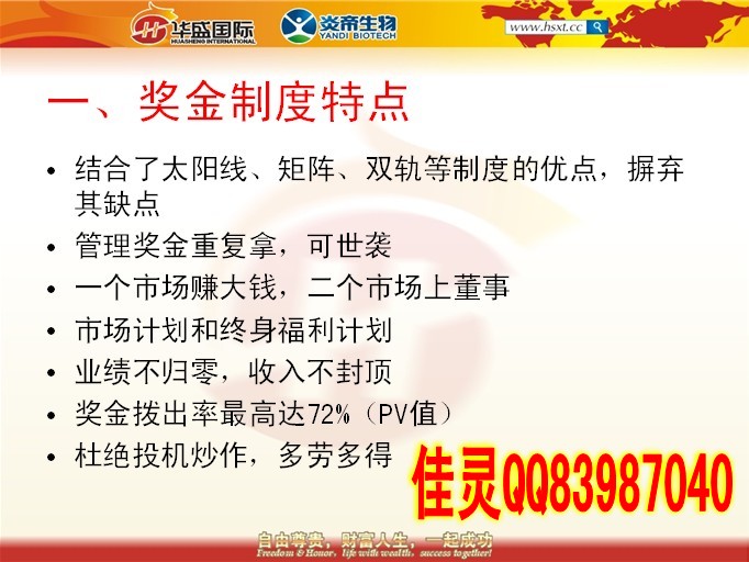 佳靈老師簡介:華盛國際團隊核心領導人之一,區(qū)域總監(jiān),團隊金牌講師,白手起家,運作湖南炎帝期間親自考察總公司和多個公司美好生活體驗館。炎帝生物第一品牌華盛國際團隊超級領導人佳靈老師QQ83987040團隊提供全國各市場資源共享,講師團全國各地支持。直銷E化,電子商務,您的最佳創(chuàng)業(yè)平臺!解決了傳統(tǒng)行業(yè)的許多弊端,您我的最佳選擇!(1)保險賣的是一個承諾,一個無形的產品,而直銷賣的是真真實實,實實在在的