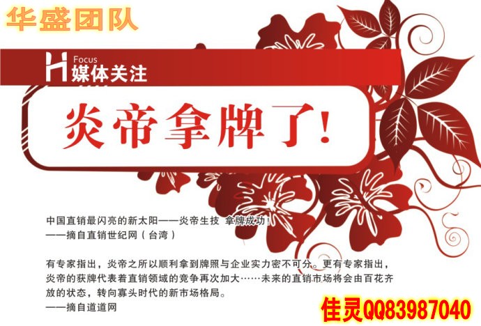 炎帝生物華盛國際集團,大夢想大格局大啟動??!華盛國際領航人,擁有數十年直銷經驗和網絡營銷經驗,曾經帶領團隊在2個直銷公司做到中國區(qū)前三名,團隊3年銷售額超過10億,是中國唯一個充分結合傳統(tǒng)直銷和網絡營銷的頂級品牌團隊!經過全面對比中國拿牌31家公司,最終和炎帝強強聯(lián)盟,實現大夢想而大啟動,誠邀各路精英加盟合作!佳靈老師簡介:華盛國際團隊核心領導人之一,區(qū)域總監(jiān),團隊金牌講師,白手起家,運作湖南炎帝