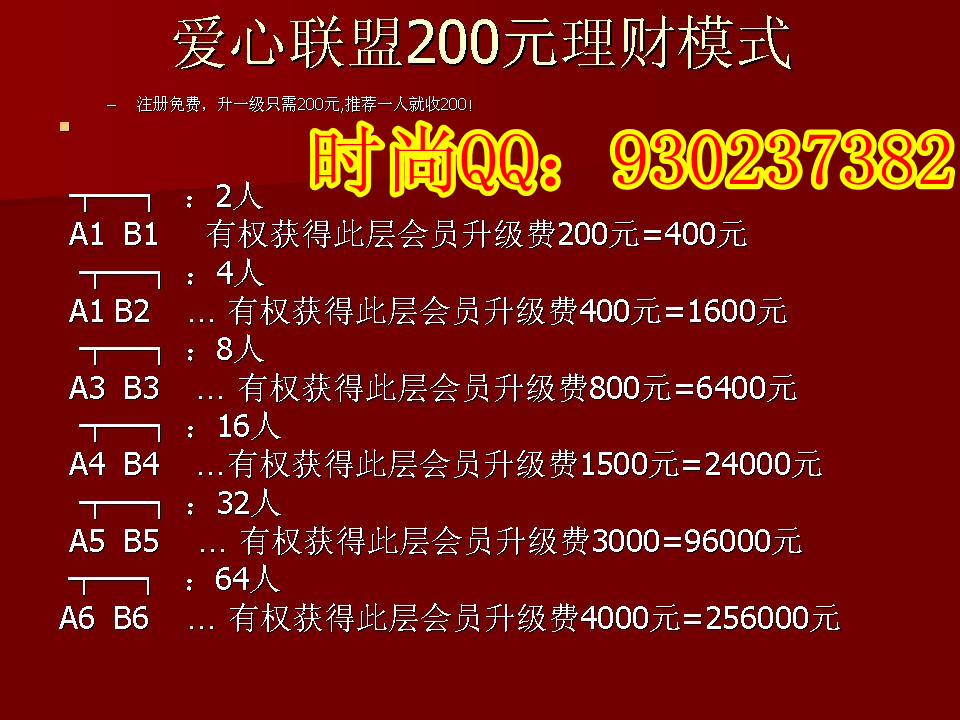 ★★保持您的100%利潤(rùn)★★不需要等待公司支付★★直接向您付款★★2x6強(qiáng)制矩陣★★只需要200元來(lái)啟動(dòng),所有人都能承擔(dān)得起★★沒(méi)有每月的服務(wù)費(fèi)也沒(méi)有管理費(fèi)★★您也為所需要幫助的人,獻(xiàn)出您的愛(ài)心《愛(ài)心聯(lián)盟創(chuàng)業(yè)規(guī)則》創(chuàng)業(yè)咨詢qq930237382游戲的具體規(guī)則如下:1.凡年滿18歲的公民,自愿繳納200元的創(chuàng)業(yè)金,即可成為愛(ài)心聯(lián)盟創(chuàng)業(yè)團(tuán)隊(duì)的正式會(huì)員,享有愛(ài)心聯(lián)盟會(huì)員的一切權(quán)利和義務(wù)。一旦確認(rèn)為愛(ài)心聯(lián)