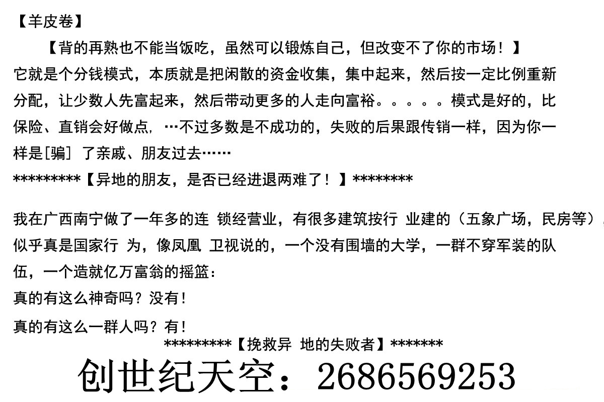 安徽合肥連鎖銷售合法嗎?是不是傳銷?安徽合肥連鎖銷售合法嗎?是不是傳銷?安徽合肥連鎖銷售合法嗎?是不是傳銷?安徽合肥連鎖銷售合法嗎?是不是傳銷?安徽合肥連鎖銷售合法嗎?是不是傳銷?安徽合肥連鎖銷售合法嗎?是不是傳銷?民間從事想要成功要具備以下5個條件:1.★要有足夠多的運作資金,保證異地操作時交得起房租,來回車費,吃得起飯!2.★要有一定的人脈,三個人雖然不多,但是也不是那么好叫的,必須也要適合這