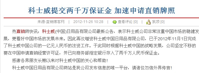 現(xiàn)在沒有,不過馬上有了。那有的朋友會問,沒有直銷牌照,合法嗎?首先電子商務(wù)還沒有立法,所以不存在合法不合法的問題。再次大家都是知道,在中國維邁店鋪里都是科士威的產(chǎn)品。而且在2010年3月2日,中國科士威有限公司已經(jīng)注冊,注冊號:440101400033224,不過由于中國的過請,必須拿到直銷牌照,公司已做出行動!想了解更多有關(guān)科士威的問題可以找佳倍,QQ:290406461