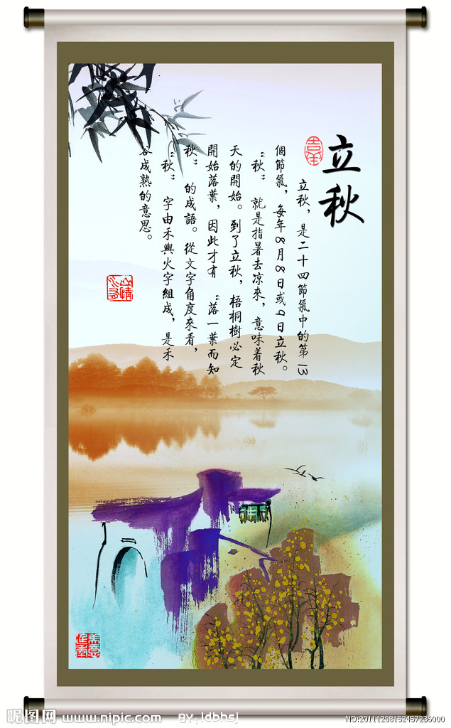 明天便是立秋,也是我的生日,順道祝福一下,哈哈!大暑之后,時序到了立秋。秋是肅殺的季節(jié),預示著秋天的到來。歷書曰:“斗指西南維為立秋,陰意出地始殺萬物,按秋訓示,谷熟也?!边@時太陽黃經(jīng)為135度。從這一天開始,天高氣爽,月明風清,氣溫由熱逐漸下降。有諺語說:“立秋之日涼風至”,即立秋是涼爽季節(jié)的開始。但由于我國地域遼闊幅員廣大,緯度、海拔高度不同,實際上是不可能在立秋這一天同時進入涼爽的秋季的。從