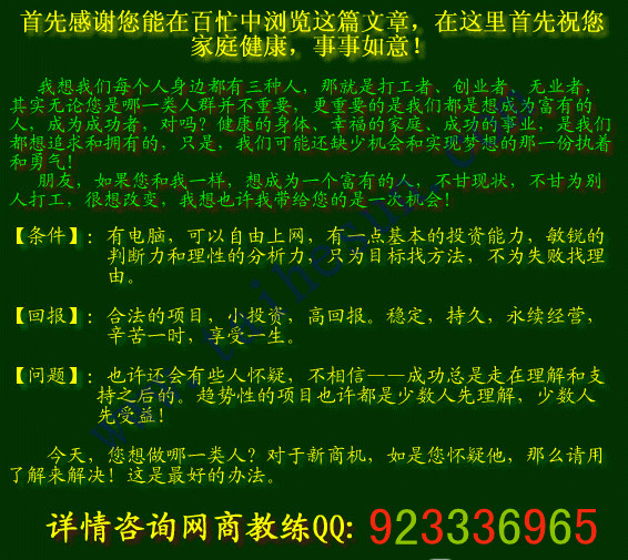 首先感謝您能在百忙中瀏覽這篇文章,在這里首先祝您家庭健康,事事如意!我想我們每個人身邊都有三種人,那就是打工者、創(chuàng)業(yè)者、無業(yè)者,其實無論您是哪一類人群并不重要,更重要的是我們都是想成為富有的人,成為成功者,對嗎?健康的身體、幸福的家庭、成功的事業(yè),是我們都想追求和擁有的,只是,我們可能還缺少機會和實現(xiàn)夢想的那一份執(zhí)著和勇氣!朋友,如果您和我一樣,想成為一個富有的人,不甘現(xiàn)狀,不甘為別人打工,很想改