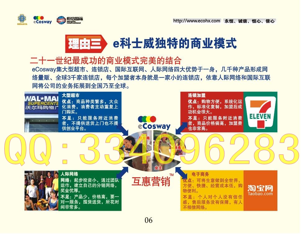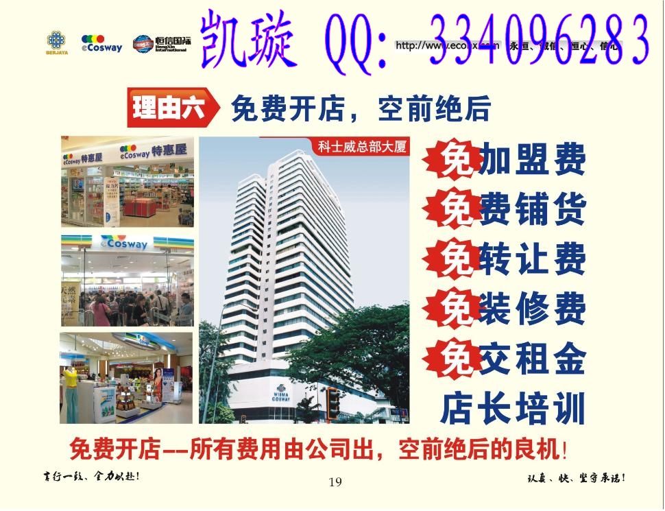 ★★★★★世界首富比爾蓋茨:誰能掌握通路,他就能掌握成功之路!21世紀(jì)要么電子商務(wù),要么無務(wù)可商!★★★★★李嘉誠(chéng):當(dāng)一個(gè)新生事物出現(xiàn),5%人做這就是機(jī)會(huì),50%知道做個(gè)消費(fèi)者,超過50%你看都不用去看!什么是科士威?---簡(jiǎn)單說科士威是一個(gè)跨國(guó)經(jīng)營(yíng)33年國(guó)際型大超市消費(fèi)就加盟會(huì)員享有會(huì)員價(jià)同時(shí)每次消費(fèi)都有業(yè)績(jī)積分在你后面辦會(huì)員卡的朋友他們的消費(fèi)也都會(huì)納入你的業(yè)績(jī)業(yè)績(jī)用于計(jì)算獎(jiǎng)金,也就是省錢加賺錢
