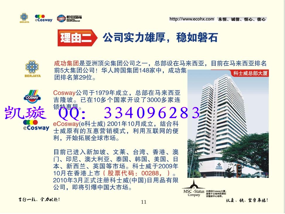科士威公司(Cosway)——吉隆坡證券交易所股票上市公司(代碼4812),成立于1979年12月,隸屬于成功集團(tuán)轄下的科士威集團(tuán)。科士威的總部位于馬來西亞,在菲律賓、泰國(guó)、新加坡及墨西哥設(shè)有分公司??剖客幌蛞浴疤峁┫M(fèi)者價(jià)格便宜的優(yōu)良商品”為經(jīng)營(yíng)理念,通過郵購(gòu)及折扣商店的方式,提供給消費(fèi)者種類眾多且價(jià)格確實(shí)便宜的優(yōu)良商品,在日用品的市場(chǎng)中以互惠營(yíng)銷的概念,將消費(fèi)者及經(jīng)營(yíng)者串聯(lián)起來,成功地落實(shí)了