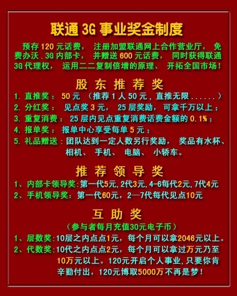 聯(lián)通3G創(chuàng)業(yè)導師-聯(lián)通3G=松山老師QQ274530566真誠分享:聯(lián)通3G卡項目推廣,120元注冊辦理,采用幾何倍增原理,二二復制。最新版獎金公布:一、層數(shù)獎【股東會員獎】1、直接推薦獎——推薦1個用戶獎勵50元(推薦多少不封頂,多勞多得)2、團隊分紅獎——見點分紅3元(自己傘下團隊每產(chǎn)生一個用戶分紅獎勵3元)3、報單商務中心獎——商務中心每激活1單獎勵5元4、重復消費獎——傘下伙伴每充值話費1