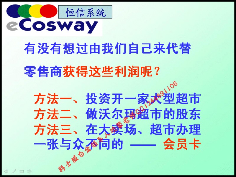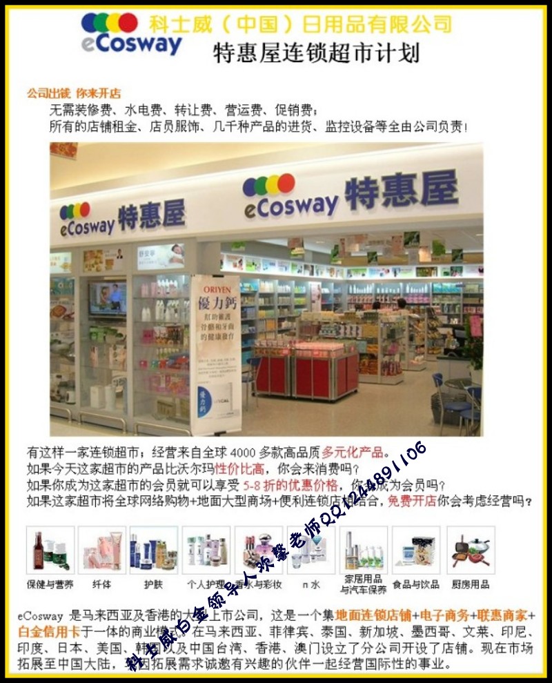 焦作e科士威ecosway一個前所未有的創(chuàng)業(yè)商機(QQ:1244891106)焦作ecoswaye科士威是馬來西亞成功集團旗下的電子直銷商務(wù)平臺,作為一個超級空中購物超市,其經(jīng)營著全球幾千種品牌產(chǎn)品,通過其無處不在的郵政運輸網(wǎng)絡(luò)將這些物美價廉的產(chǎn)品輸送到千家萬戶。作為一家向消費者提供購物創(chuàng)業(yè)機會的直銷公司,ecoswaye科士威不能說是絕后,但絕對是空前的,其獨特新穎的經(jīng)營模式一來到中國,立即就引