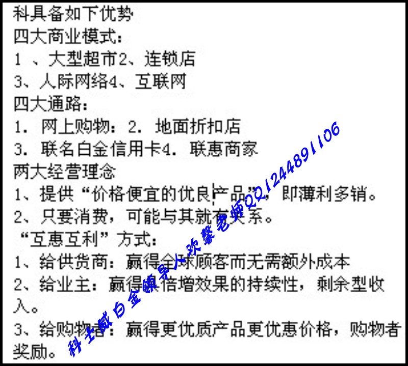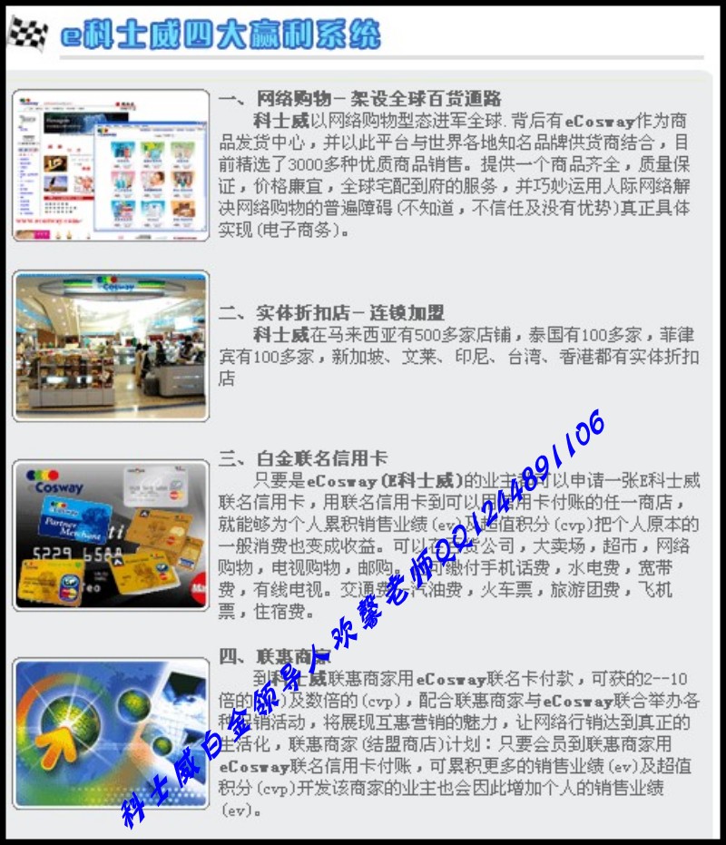 從聯(lián)名白金卡看e科士威的運作模式(日常消費刷卡還返還獎金,天大的好事?。。┌捉鹦庞每ü烙嫭F(xiàn)在很多人聽起來很陌生,因為是近幾年在國內(nèi)才有的辦理,它是銀行卡里面等級最高的卡,百萬富翁都不一定辦得到,不信你可以銀行打聽一下,在香港的招商銀行辦理白金卡必須要有100萬的存款,而且每年都必須交1500塊的年費才給你辦卡。這樣的卡為什這么貴呢?因為這個卡的本身銀行機構(gòu)就已經(jīng)跟全球的很多商家洽談了聯(lián)惠,只要你出