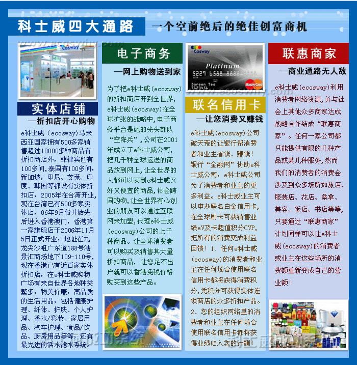有人說科士威是電子商務(wù),像淘寶網(wǎng)一樣。但是科士威和淘寶網(wǎng)完全不是一個(gè)檔次,淘寶網(wǎng)是C2C網(wǎng)站,商家都是個(gè)人,而科士威是B2C網(wǎng)站,商家是企業(yè)。淘寶網(wǎng)雖然很出名,但是只限在中國國內(nèi)銷售,商家信用度參差不齊。科士威是國際跨國購物,全球訂購,宅配到府,產(chǎn)品品質(zhì)全球統(tǒng)一,多國認(rèn)證。不像某些產(chǎn)品只限在特定區(qū)域銷售,產(chǎn)品品質(zhì)無法達(dá)到國家及流通區(qū)域的品質(zhì)要求。想想看,能夠全球流通的商品品質(zhì)如何?一家公司的產(chǎn)品能