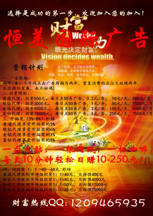 大家好!我是恒美玄偌。創(chuàng)點擊廣告投資能不能賺錢?是如何操作的?朋友們:現(xiàn)在很多的年輕人都喜歡在網(wǎng)絡上找一些小本生意做做,我也其中一個!在這網(wǎng)絡大市場當中不缺乏項目,這也是網(wǎng)絡的優(yōu)點,多年的網(wǎng)zhuan生涯,讓我深刻理會一到天上沒有掉餡餅的事!那么多網(wǎng)絡項目當中,無非就是簡單點有的復雜點。但是都需要投資,也有不少不需要資的,幫別人刷東西呀等等!那才是真辛苦`一天拼命也就二三十塊錢,我也做過不少投資的