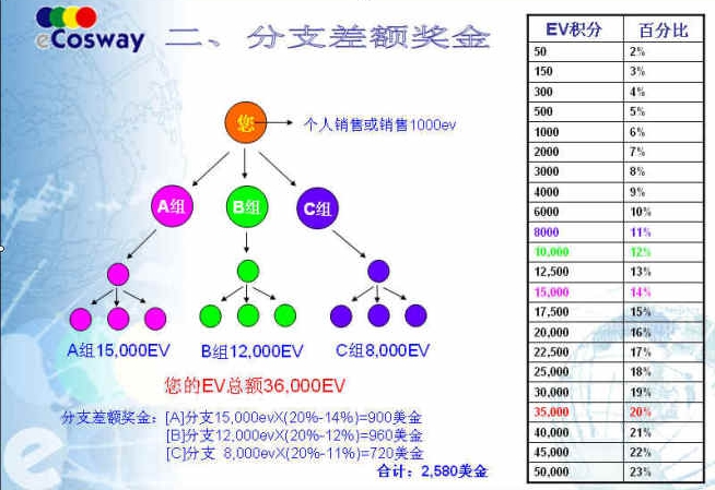 分支差額獎,就是您的業(yè)績跟您下面部門業(yè)績之間的差額獎金。如上圖,您的總業(yè)績是36000ev, 那就用3600ev的百分比20%減去A部門15000ev的百分比14% : 20%-14%=6% ,那A部門的業(yè)績15000 X 6%=900美金 這是A組您所得的差額獎金,于此相同B 、C部門的業(yè)績也是這么算! 這三個部門的差額獎金都可以領取。