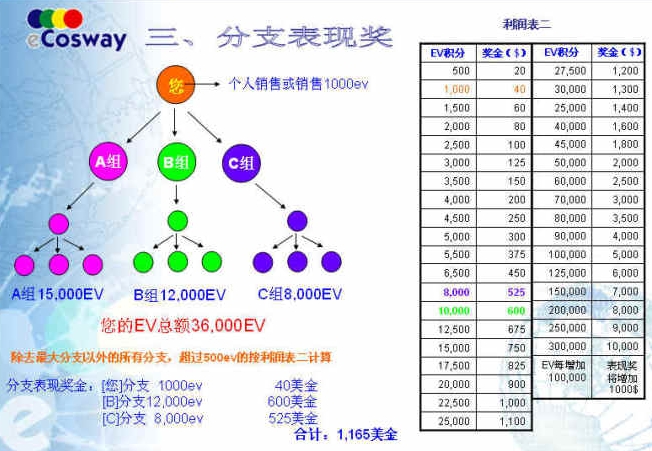 分支表現(xiàn)獎,表現(xiàn)表現(xiàn),也就您把你的部門整體帶領得如何。除去一個最大的部門業(yè)績(合格分支),剩下的部門業(yè)績、個人業(yè)績對照業(yè)績表領取。如上圖,A部門業(yè)績最大,作為合格分支,不算獎金。您個人業(yè)績1000ev對照表可領取40美金,B部門對照領取600美金,C部門對照領取525美金。