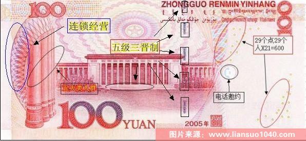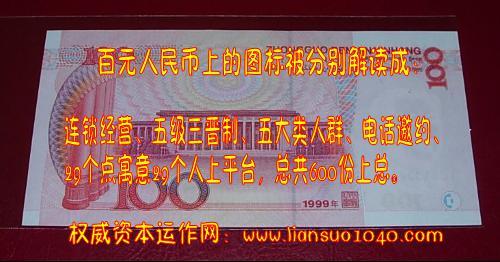 百元人民幣上的圖標(biāo)被分別解讀成:連瑣經(jīng)營、五級三晉制、五大類人群、電話邀約、29個點寓意29個人上平臺,總共600份上總。