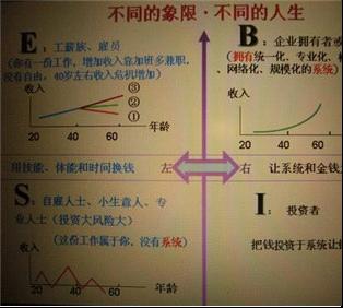 綜上所述,E、S象限的族群難以賺大錢獲得財(cái)務(wù)自由,B、I象限的族群較容易獲取錢財(cái)從而財(cái)務(wù)自由。要擁有系統(tǒng)為自己工作,才能跨入B象限,從而實(shí)現(xiàn)人人追求的財(cái)務(wù)自由。