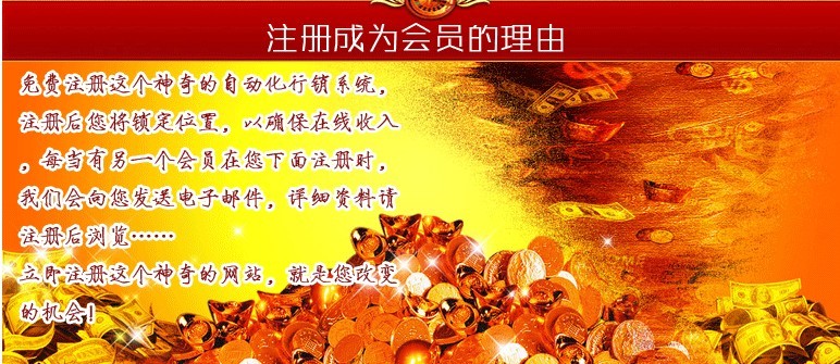 免費注冊這個令人難以置信的系統(tǒng),注冊后你將鎖定位置,以確保在線收入。每當有另一人在你下面的位置時,我們會向你發(fā)送電子郵件。詳細資料請注冊瀏覽…