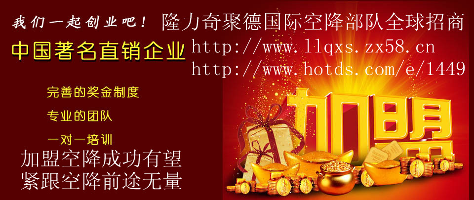 隆力奇聚德國際空降部隊財富聯(lián)盟湖南隆力奇為千千萬萬敢于挑戰(zhàn)高薪的行業(yè)精英提供支持與服務,民族隆力奇、百年隆力奇、世界隆力奇提供平臺。湖南隆力奇黃曉蓉http://m.kmaudio.cn/e/4003打造中國最大最專業(yè)的網(wǎng)絡直銷門戶,熱直銷網(wǎng)開拓網(wǎng)絡直銷新浪潮!