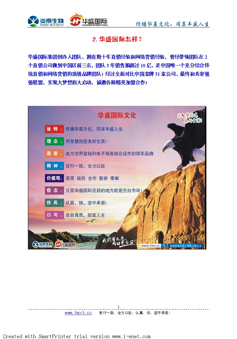華盛國際集團(tuán)創(chuàng)辦人團(tuán)隊(duì),擁有數(shù)十年直銷經(jīng)驗(yàn)和網(wǎng)絡(luò)營銷經(jīng)驗(yàn),曾經(jīng)帶領(lǐng)團(tuán)隊(duì)在2個(gè)直銷公司做到中國區(qū)前三名,團(tuán)隊(duì)3年銷售額超過10億,是中國唯一個(gè)充分結(jié)合傳統(tǒng)直銷和網(wǎng)絡(luò)營銷的頂級(jí)品牌團(tuán)隊(duì)!經(jīng)過全面對(duì)比中國拿牌31家公司,最終和炎帝強(qiáng)強(qiáng)聯(lián)盟,實(shí)現(xiàn)大夢(mèng)想而大啟動(dòng),誠邀各路精英加盟合作!