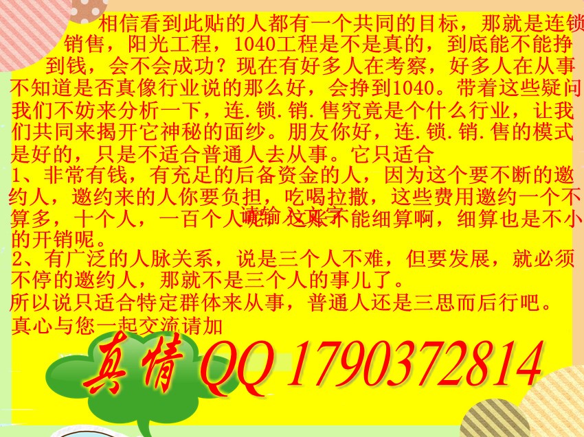朋友你好:或許我們都有著類(lèi)似的經(jīng)歷,2011年年初,我被朋友用謊言邀約到異地考察行業(yè),和多數(shù)人一樣在煩躁、惱怒、抵觸、懷疑的情緒中開(kāi)始了解異地資笨運(yùn)作,隨著考察的深入,對(duì)行業(yè)的認(rèn)識(shí)和態(tài)度也逐漸轉(zhuǎn)變,通過(guò)7天的考察和幾天的考慮及籌備,開(kāi)始了我認(rèn)為會(huì)改變我一生的陽(yáng)光之路。然而事實(shí)并非之前想象的那樣順利,迫于各種壓力,沒(méi)堅(jiān)持多久,我放棄了。我愿把我的認(rèn)識(shí)與感想分享給您,希望能幫助您全面客觀的分析這個(gè)行業(yè),然后做出正確的選擇。真誠(chéng)交流★浩瀚:QQ906792885★揭秘異地剖析網(wǎng)資異地必須了解的十個(gè)問(wèn)題【第一】合法還是違法???詳細(xì)咨詢(xún)交流加扣扣:浩瀚906792885法律的基本原則:有法可依、有法必依、執(zhí)法必嚴(yán)、違法必究。目前沒(méi)有任何一部法律來(lái)約束資笨運(yùn)作,所以不違法,也不合法。那么由誰(shuí)來(lái)管理呢?是不是放縱行業(yè)任意發(fā)展呢?肯定不是。媒體,輿論的負(fù)面宣傳,本身就是一種行之有效的管理、限制手段。雖然大多數(shù)異地從業(yè)者以失敗告終,然而在這個(gè)龐大的人口基數(shù)下,成功者的數(shù)量也是不少的,我認(rèn)識(shí)的也有幾個(gè),到目前為止沒(méi)有任何人或組織找他們的麻煩,基本都做了自己的生意,或大或小。有的說(shuō)上總了有什么生命危險(xiǎn),目前我沒(méi)聽(tīng)說(shuō)過(guò),更沒(méi)見(jiàn)過(guò)?!镜诙孔ト耸钦娴倪€是假的??詳細(xì)咨詢(xún)交流加扣扣:浩瀚906792885有的是真的,有的是假的!假的多,真的少!例行的調(diào)控,走過(guò)場(chǎng),會(huì)把行業(yè)里面的人帶進(jìn)派出所,把家里面的東西從窗戶(hù)往外仍,桌子、椅子、廚具……乒乒乓乓,聲勢(shì)造的越大越好,有時(shí)候還有錄像的,圍觀的當(dāng)?shù)厝嗽蕉嘣胶?。進(jìn)去后,一般是傍晚的時(shí)候放出來(lái),因?yàn)檫@個(gè)時(shí)候當(dāng)?shù)厝硕蓟丶伊?,悄悄的放出?lái),當(dāng)?shù)厝艘詾榍采⒒丶伊?。針?duì)有的體系發(fā)生了刑事案件,或者體系本來(lái)就不健康,當(dāng)?shù)亍菊扛胨麄冓s走,那么這樣的調(diào)控就是來(lái)真格的,把所有的人遣散走,至于回不回家沒(méi)關(guān)系,反正不要在我這里做就行了。每年都有被趕走的體系,因?yàn)楫?dāng)?shù)匾S穩(wěn),要保持行業(yè)健康?!镜谌克麄冋f(shuō)的話都是真的嗎??個(gè)人的經(jīng)歷,一般沒(méi)有說(shuō)假話的,因?yàn)楸緛?lái)行業(yè)就追求人人平等,而且很多平凡角色成功的案例,可以拿來(lái)做正面教材。行業(yè)的經(jīng)歷,一般沒(méi)有說(shuō)真話的,道理再簡(jiǎn)單不過(guò)了,報(bào)喜不報(bào)憂!行業(yè)本身有難度,發(fā)展不動(dòng)回家的,你自然見(jiàn)不著。有的人來(lái)了三、四年了都還沒(méi)成功,要實(shí)話實(shí)說(shuō)的話誰(shuí)還敢做?所以都告訴你:我來(lái)了半年了,或者一年了,發(fā)展的不錯(cuò),很快就要上總了。。。【第四】行業(yè)三座大山是什么??詳細(xì)咨詢(xún)交流加扣扣:浩瀚9067928851.市場(chǎng)壓力叫花子都有三個(gè)朋友難道你沒(méi)有嗎?這句話刺激了很多的人加入。其實(shí),仔細(xì)的分析下這三個(gè)人,實(shí)質(zhì)是三片市場(chǎng)。行業(yè)發(fā)展的是人際網(wǎng)絡(luò),而人際網(wǎng)絡(luò)有個(gè)天然的死穴——互相之間有聯(lián)系。所以一旦來(lái)了個(gè)不認(rèn)可的,回去后經(jīng)他一宣傳,整片市場(chǎng)完蛋,這速度可不止于三的倍增了,不管你有多少的親戚朋友,全都不會(huì)來(lái)了。你知道你朋友干傳銷(xiāo)了,你還會(huì)去嗎?這是80%失敗者的主要原因。2.經(jīng)濟(jì)壓力邀約考察絕不僅僅是三個(gè)人,我一共接了八個(gè)人,而每個(gè)人的花費(fèi),最少的1500,一般都在2000左右,你幫我算算我光接人就花了多少錢(qián)?我說(shuō)我現(xiàn)在做的是幾百上千萬(wàn)的生意,那么即使我以前是個(gè)叫花子,現(xiàn)在也要花錢(qián)包裝一下自己:住好的房子,穿好的,吃好的,花錢(qián)大方,加上房租及日常的生活開(kāi)銷(xiāo),手里沒(méi)幾萬(wàn)運(yùn)作資金真玩不轉(zhuǎn)。3.精神壓力因?yàn)槲覀兪怯弥e言叫去的人,所以那些看不懂的人肯定得罪了,而且,他告訴別人后,連那些沒(méi)來(lái)的人都得罪了,為什么?在中國(guó),做傳銷(xiāo),很多人認(rèn)為是比坐牢還恥辱的事情!所以很多異地的朋友,一邊要承受發(fā)展不好所帶來(lái)的經(jīng)濟(jì)壓力,同時(shí)要忍受親戚朋友的指責(zé),甚至是辱罵,毫不夸張,那樣的日子,你準(zhǔn)備好了嗎?【第五】成功概率有多大??平均5%以?xún)?nèi),不可能像異地的人說(shuō)的100%。成功概率還和體系的健康程度有關(guān)系,親情線發(fā)展過(guò)多,那就是一將功成萬(wàn)骨枯。【第六】我適合做行業(yè)嗎??我們把異地從業(yè)者簡(jiǎn)單的分成三大類(lèi)。詳細(xì)咨詢(xún)交流加扣扣:浩瀚906792885第一類(lèi):成功人士有錢(qián)有關(guān)系,但同時(shí)他們的弊端也很明顯。1.容易放棄行業(yè),來(lái)的時(shí)間一久,自然知道行業(yè)的困難,而丟7萬(wàn)塊錢(qián)對(duì)他們無(wú)足輕重。2.不會(huì)全職運(yùn)作,經(jīng)常往