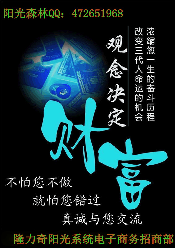 一根網(wǎng)線,一臺(tái)電腦,一杯咖啡, 輕輕松松住家創(chuàng)業(yè)。朋友,只要您還有夢(mèng)想,只要您有時(shí)間上網(wǎng),只要您肯付出玩游戲的時(shí)間,在隆力奇陽光國際電子商務(wù)中,您一定能成功!實(shí)行一年打拼月薪過萬,兩年打拼周薪過萬的夢(mèng)想!