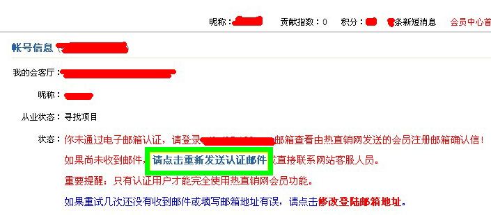 3、 如果你確定郵箱地址沒有填寫錯(cuò)誤,而且也沒有在垃圾信箱中找到注冊(cè)確認(rèn)信,那么你可以嘗試點(diǎn)擊會(huì)員中心的“請(qǐng)點(diǎn)擊重新發(fā)送認(rèn)證郵件”。
