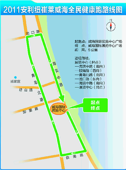 本次全民健康跑由威海國(guó)際展覽中心廣場(chǎng)出發(fā),沿海濱中路往南—經(jīng)膠南路向西—至青島北路向北—轉(zhuǎn)至滄口路向東—回到海濱中路向南—最終返回威海國(guó)際展覽中心廣場(chǎng)結(jié)束,全程約為5公里。本次活動(dòng)不設(shè)報(bào)名門檻,凡身心健康者均可報(bào)名參賽。主辦方同時(shí)接受團(tuán)體和個(gè)人報(bào)名,團(tuán)體報(bào)名地點(diǎn)為市體育局群體科;個(gè)人報(bào)名地點(diǎn)為經(jīng)區(qū)上海路12號(hào),報(bào)名電話為3637888—380。報(bào)名工作將于10月8日中午12時(shí)結(jié)束。參賽者將獲贈(zèng)T恤一件,主辦方還將為參賽者統(tǒng)一購(gòu)買保險(xiǎn)。