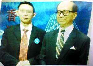 犯罪嫌疑人與“李嘉誠(chéng)”(實(shí)為蠟像)的合影。圖片為記者翻拍