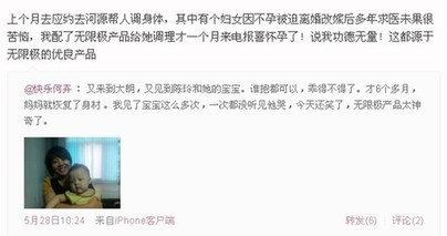 微博名為“520小琪琪77”在其微博上發(fā)表微博,稱︰“上個月去應(yīng)約去河源幫人調(diào)身體,其中有個婦女因不孕被迫離婚改嫁後多年求醫(yī)未果很苦惱,我配了無限極產(chǎn)品給她調(diào)理才一個月來電報喜懷孕了!說我功德無量!這都源于無限極的優(yōu)良產(chǎn)品”