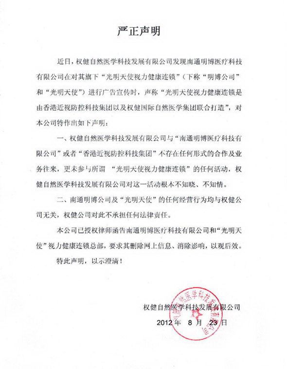 權(quán)健又生廣告宣傳糾紛 發(fā)聲明與“光明天使”無合作