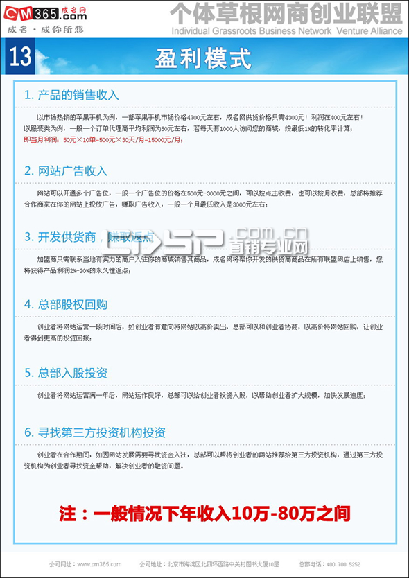 我們先來(lái)看看這個(gè)成名網(wǎng)的商業(yè)模式:加盟商加盟成名網(wǎng),首先要付6800的加盟費(fèi),付錢(qián)之后他們給我們一個(gè)獨(dú)立域名或二級(jí)域名,程序和服務(wù)器都是成名網(wǎng)的,加盟商對(duì)網(wǎng)站沒(méi)有任何的控制權(quán)力,只能賣(mài)成名網(wǎng)的產(chǎn)品,加盟商拿的只是提成,而6800的加盟費(fèi)也有些涉?zhèn)飨右?。?jù)加盟商透露,問(wèn)題的關(guān)鍵是成名網(wǎng)內(nèi)部還有拉下線的提成,每天給加盟商洗腦,然后就是你騙我,我騙他的傳銷(xiāo)模式。顯然,如果按照加盟商的說(shuō)法,成名網(wǎng)的確疑點(diǎn)不少。