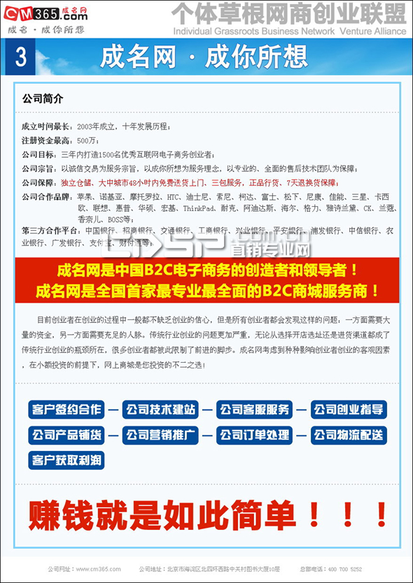 熱直銷(xiāo)網(wǎng)核心提示:“北京成名網(wǎng)電子商務(wù)有限公司是騙子公司!”近日,這樣的投訴在網(wǎng)絡(luò)上被大家熱議,有的網(wǎng)友甚至將成名網(wǎng)的詳細(xì)信息公布,“公司全稱(chēng):北京成名網(wǎng)電子商務(wù)有限公司,公司地址:北京市海淀區(qū)北四環(huán)西路68號(hào)左岸工社(中關(guān)村圖書(shū)大廈)10層,公司全稱(chēng):北京成名網(wǎng)電子商務(wù)有限公司,公司網(wǎng)站:http://www.cm365.com (網(wǎng)站負(fù)責(zé)人:謝成明 2010-06月份建立的網(wǎng)站)公司電話:400-700-5252 成名網(wǎng)廣告宣傳語(yǔ):“月賺300萬(wàn)” 。