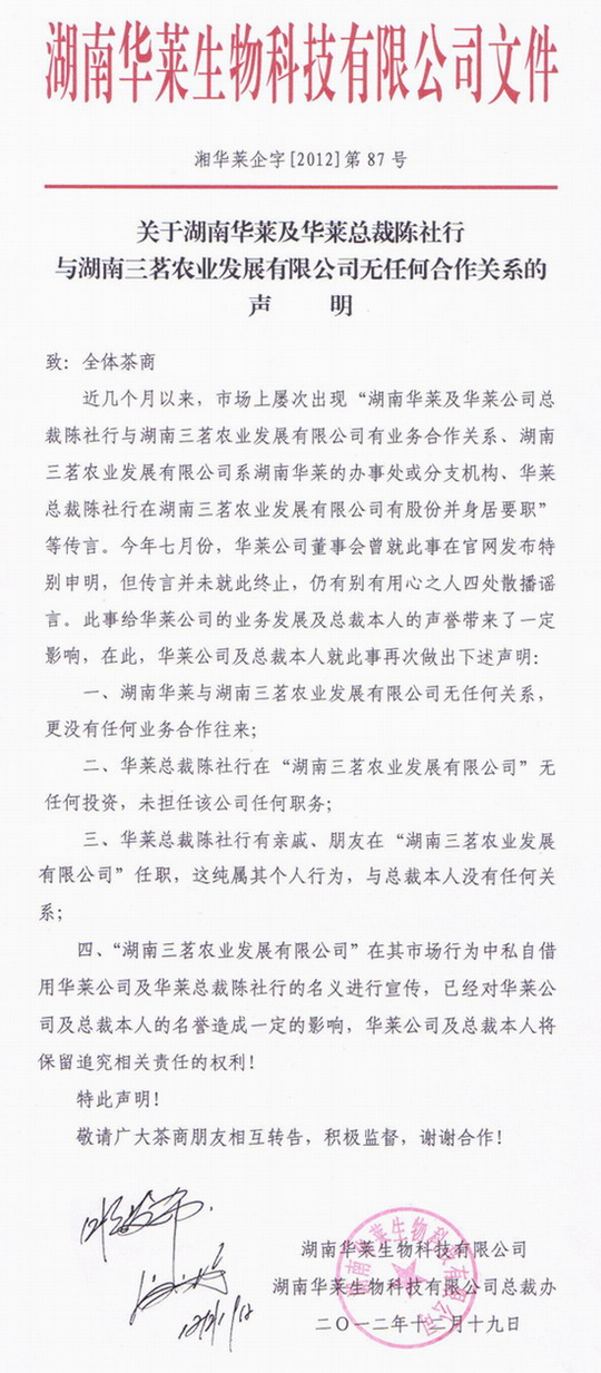 華萊聲明與湖南三茗無任何合作 提醒茶商防騙