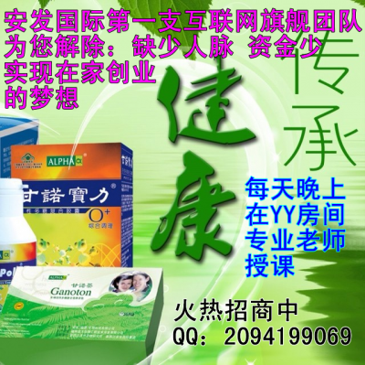 安發(fā)國(guó)際以活性多糖為主要成分微復(fù)方配伍的現(xiàn)代甘諾寶力天然藥物,具有顯著提升免疫力,細(xì)胞自治的特點(diǎn),達(dá)到了標(biāo)本兼治,平衡五臟六腑的神奇效果。安發(fā)國(guó)際甘諾寶力現(xiàn)代天然藥物的橫空出世,開(kāi)啟了“細(xì)胞養(yǎng)生自然療法”的新紀(jì)元,開(kāi)創(chuàng)了一個(gè)“值得您掌聲不斷的國(guó)際健康事業(yè)”!咨詢(xún)QQ2973311050或2094199069[詳細(xì)]